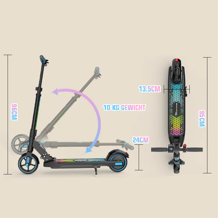 The EV06C features an advanced one-step folding system, allowing children to fold the scooter easily without parental assistance. Its lightweight design (22 LBS) makes it convenient for kids to carry up and down stairs, reducing the burden on parents. This scooter is an ideal gift for birthdays, Children's Day, Christmas, and other special occasions. It is a unique and delightful surprise that will make your child stand out among friends, providing them with a fashionable and enjoyable riding experience.